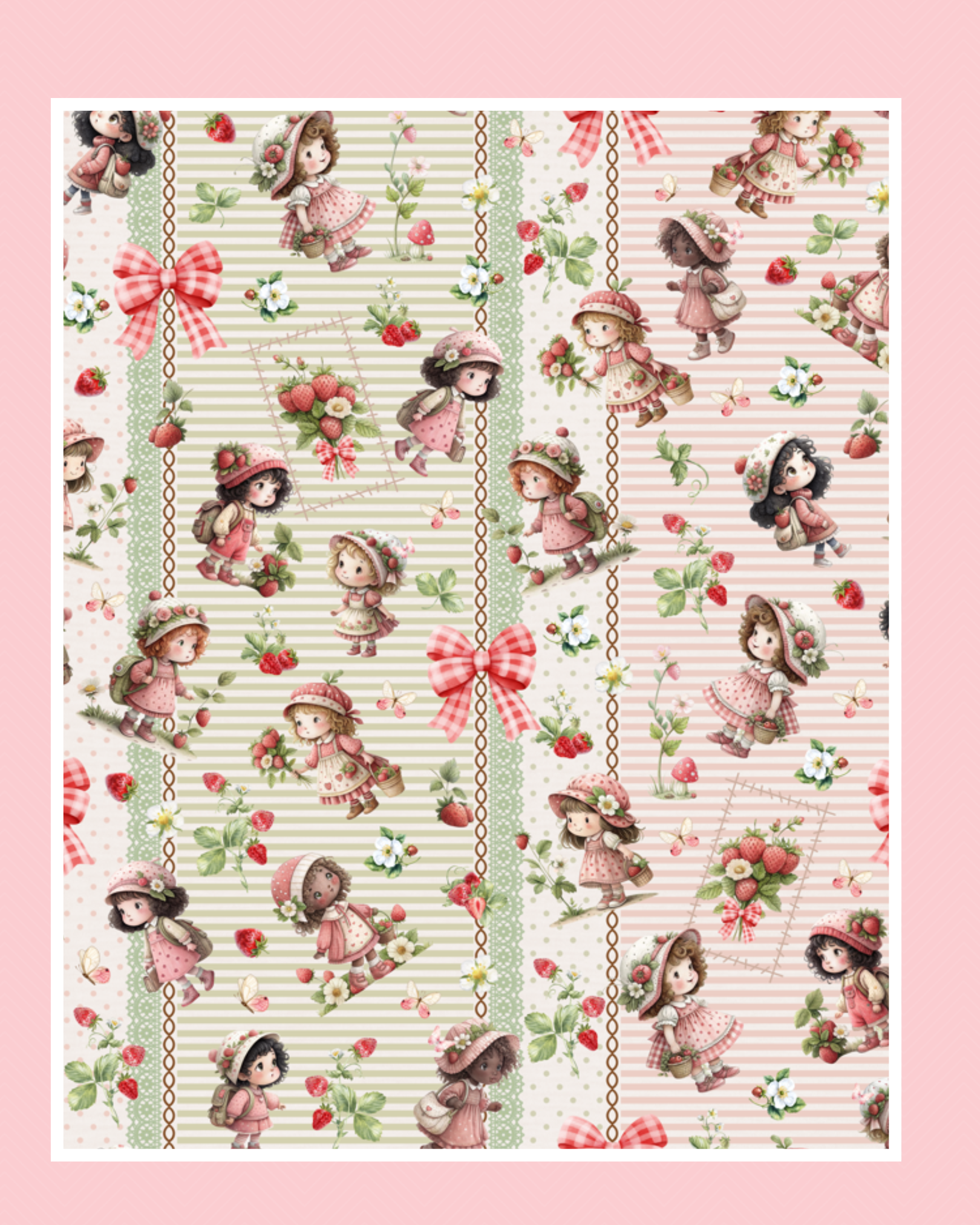 Cada estampa traz um universo doce, com morangos, laços, flores e personagens que despertam afeto e vontade de criar.
